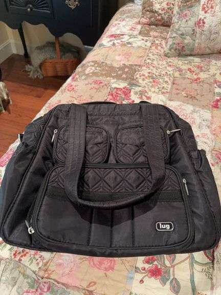 LOT 104 - Canon printer , material pieces, lug bag, and silver sheer round accent table skirt.