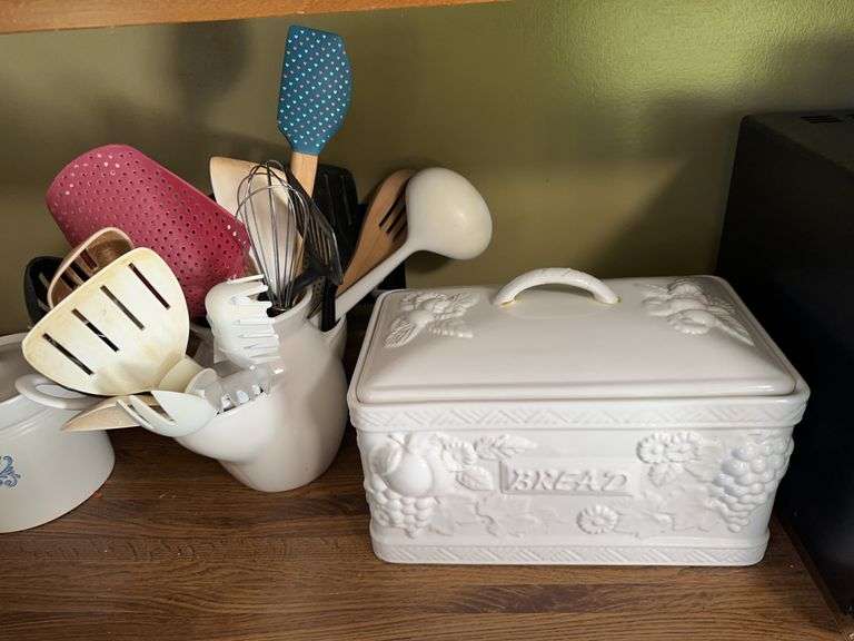 LOT 85 - Ceramic bread box (handle has been repaired), kitchen utensils in holder
