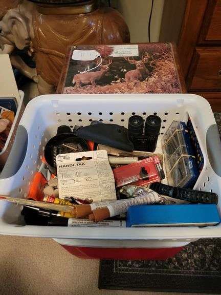 LOT 117B - Rubbermaid cooler, Wood Trinket Box w/Deer, pocket knives, misc