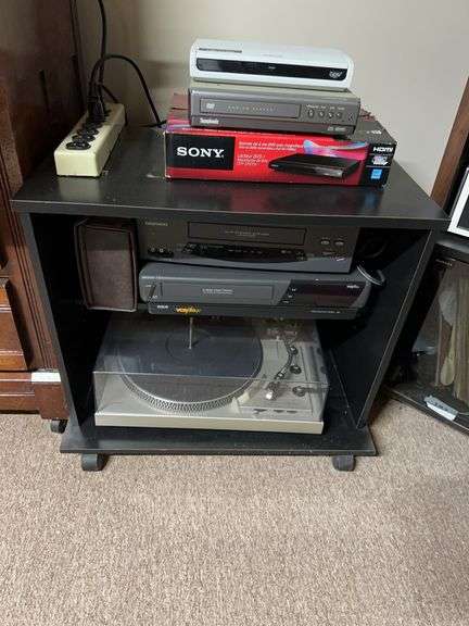LOT 191 - Sony DVD player, 2 VHS players, record player, Symphonic DVD/CD player, media cabinet