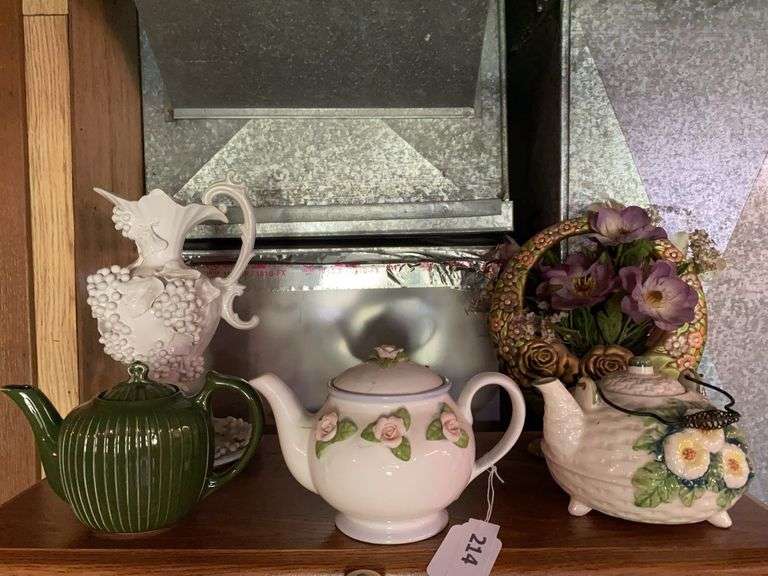 LOT 214 - Vintage ceramic pitcher, plate, vase, 3 tea pots