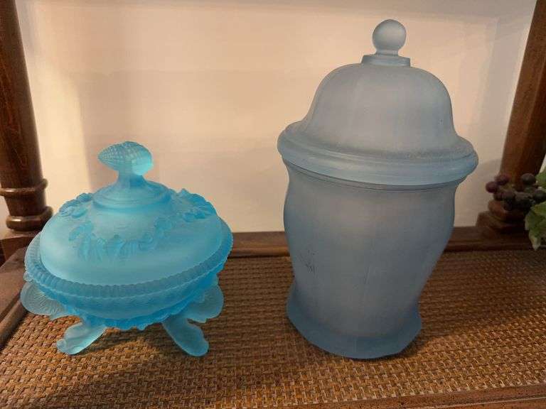 LOT 41 - Vintage Westmoreland Argonaut Light Blue Satin Lidded Candy Compote Dish 5.5", vintage Indiana glass blue satin apothecary jar 9.5"