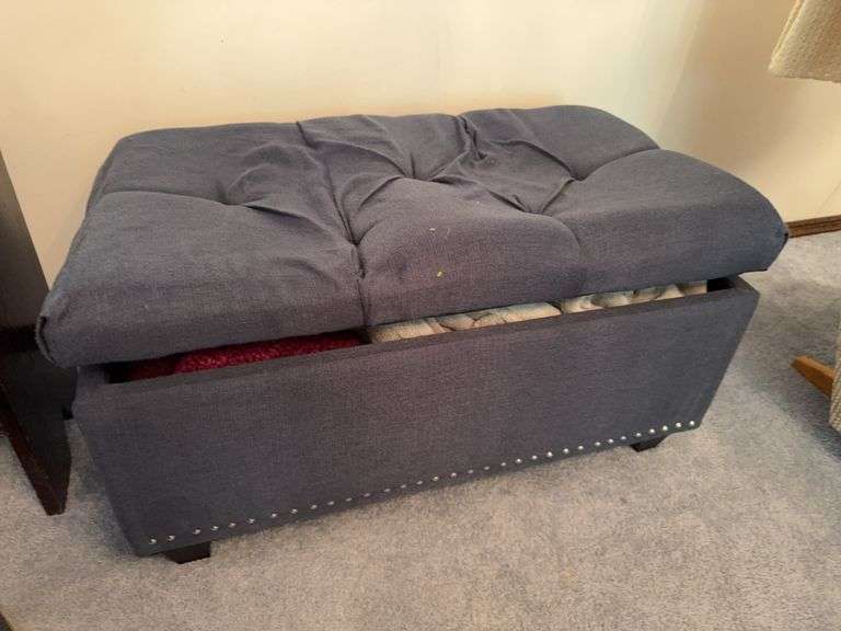 LOT 52 - Storage ottoman with blankets 20" x 12" x 17", wood stool 24" x 18" x 16"