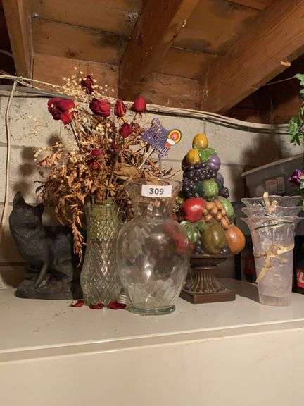 LOT 309 - Ceramic black fox, fruit center piece, vases