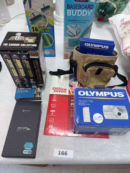 LOT 166 - Olympus camera, photo paper, VHS tapes, water broom, baseboard buddy,