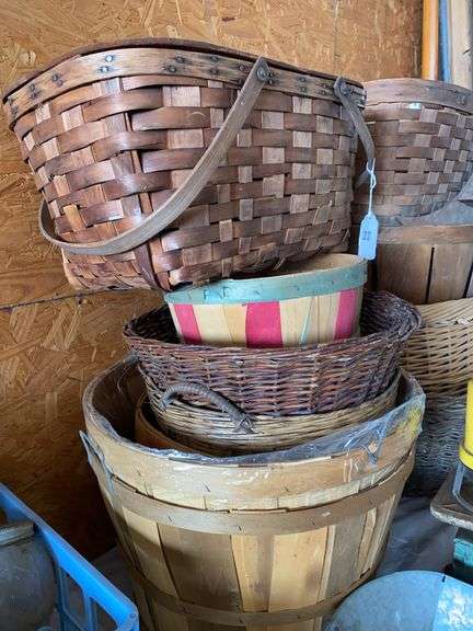 LOT 22 - Large lot of bushel baskets, picnic basket, woven baskets, wall moon shelf